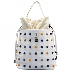 E’ proposta dal brand Jacky& Celine questa Borsa a secchiello. E’ realizzata in ecopelle bianco con applicazioni di rivetti multicolor e lucchetto logato. Veramente carina ed orginale è perfetta per il giorno ma si può indossare anche la sera. Capiente come solo le borse a secchiello sanno essere, può accompagnarvi anche per lo shopping.